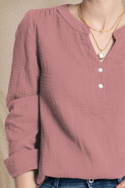 Textured Notched Long Sleeve Blouse