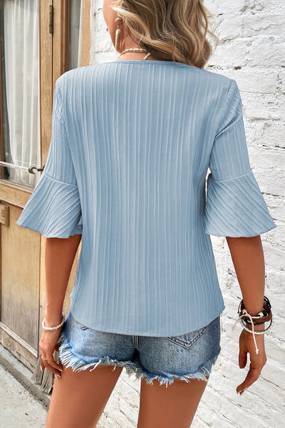 Textured V-Neck Flounce Sleeve Blouse