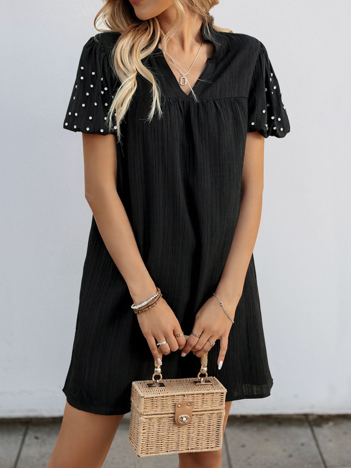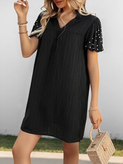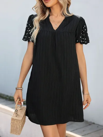 Textured V-Neck Short Sleeve Mini Dress