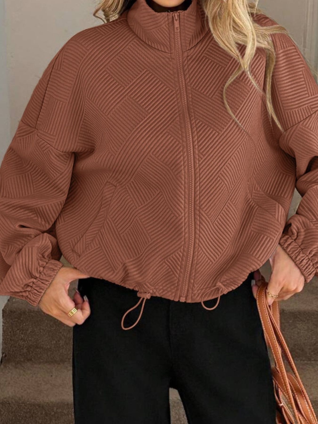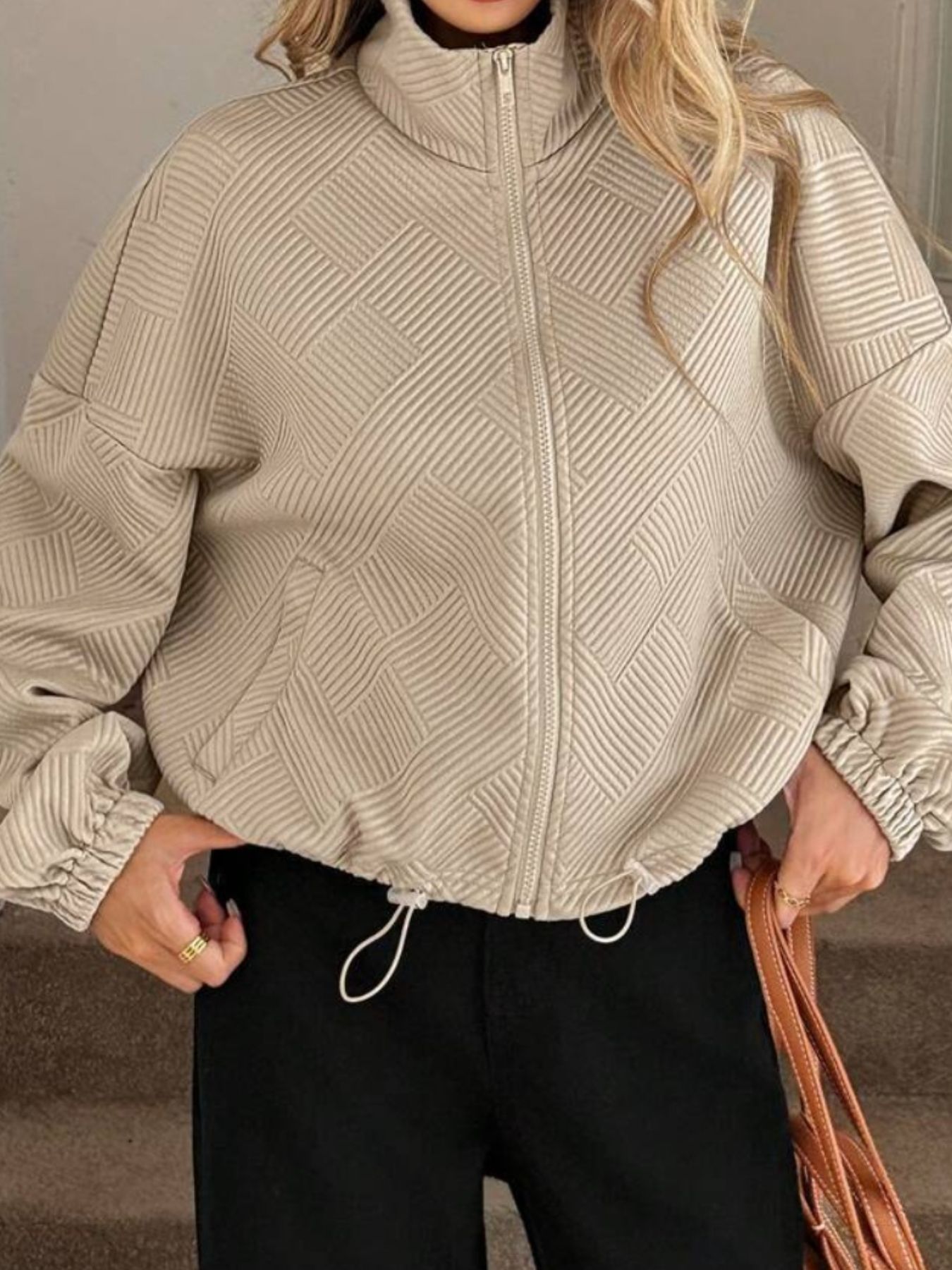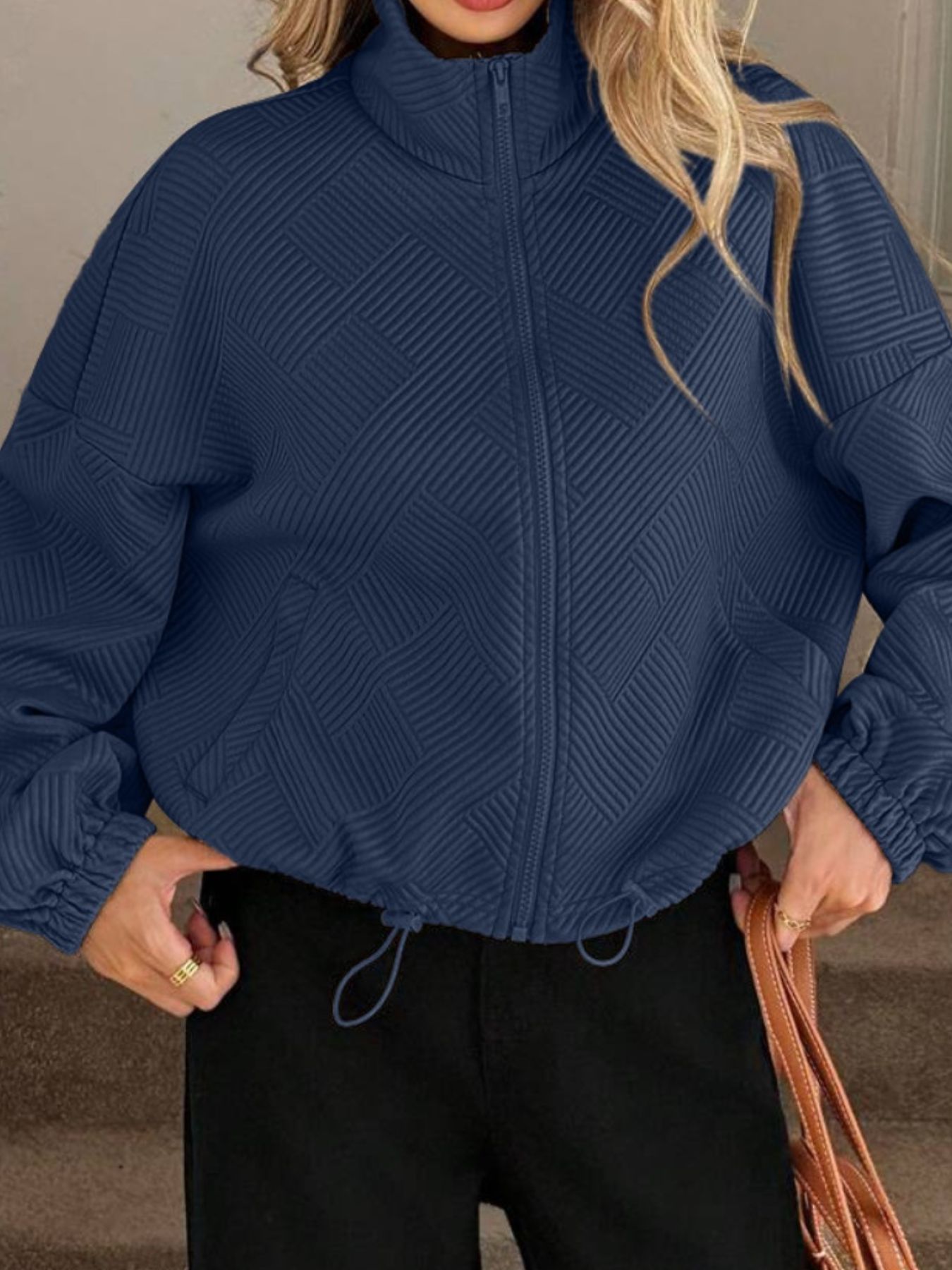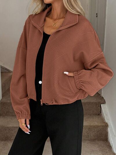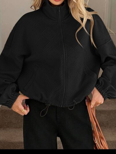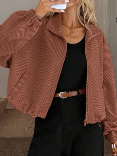 Textured Zip-Up Drawstring Hem Jacket