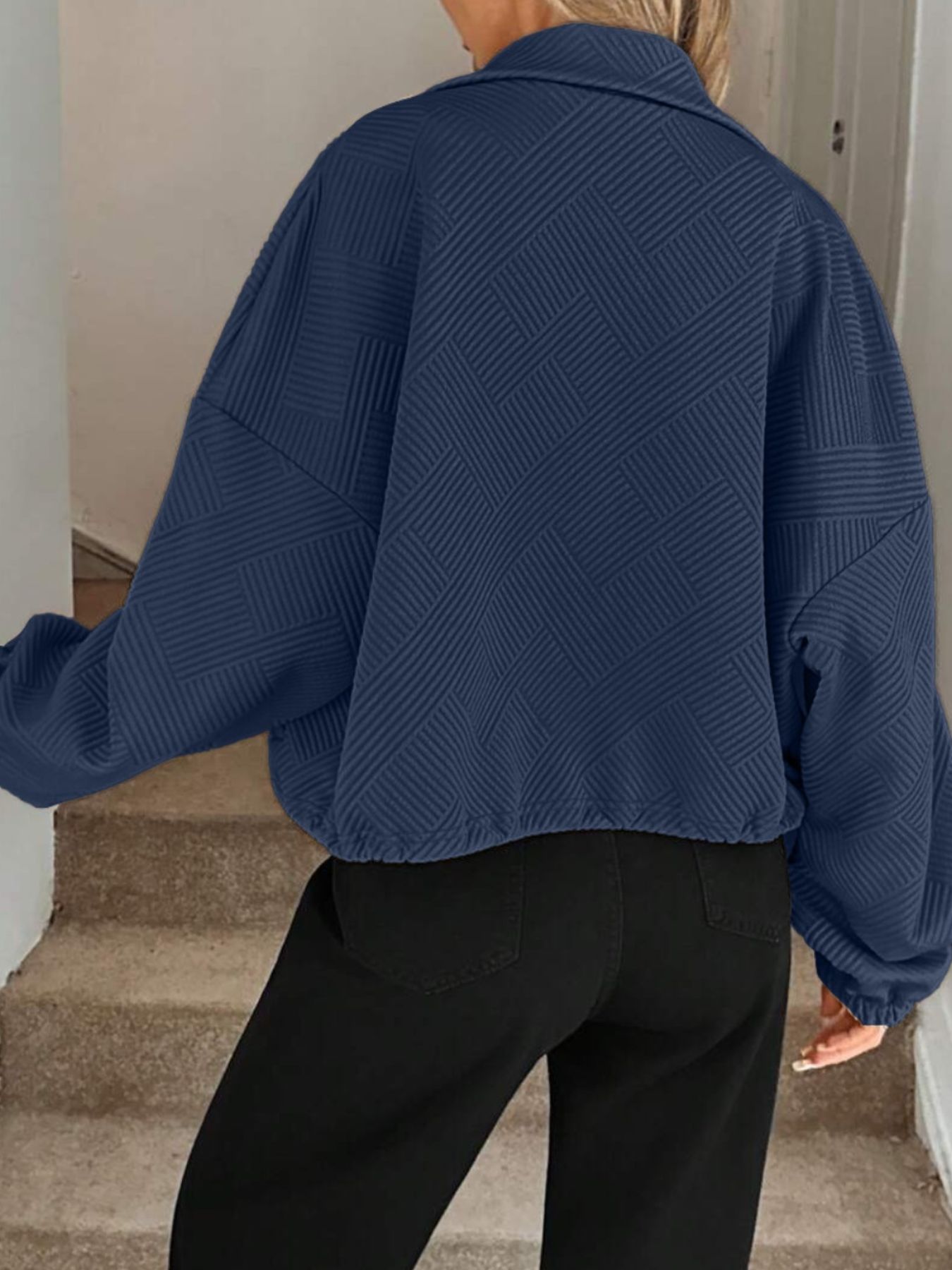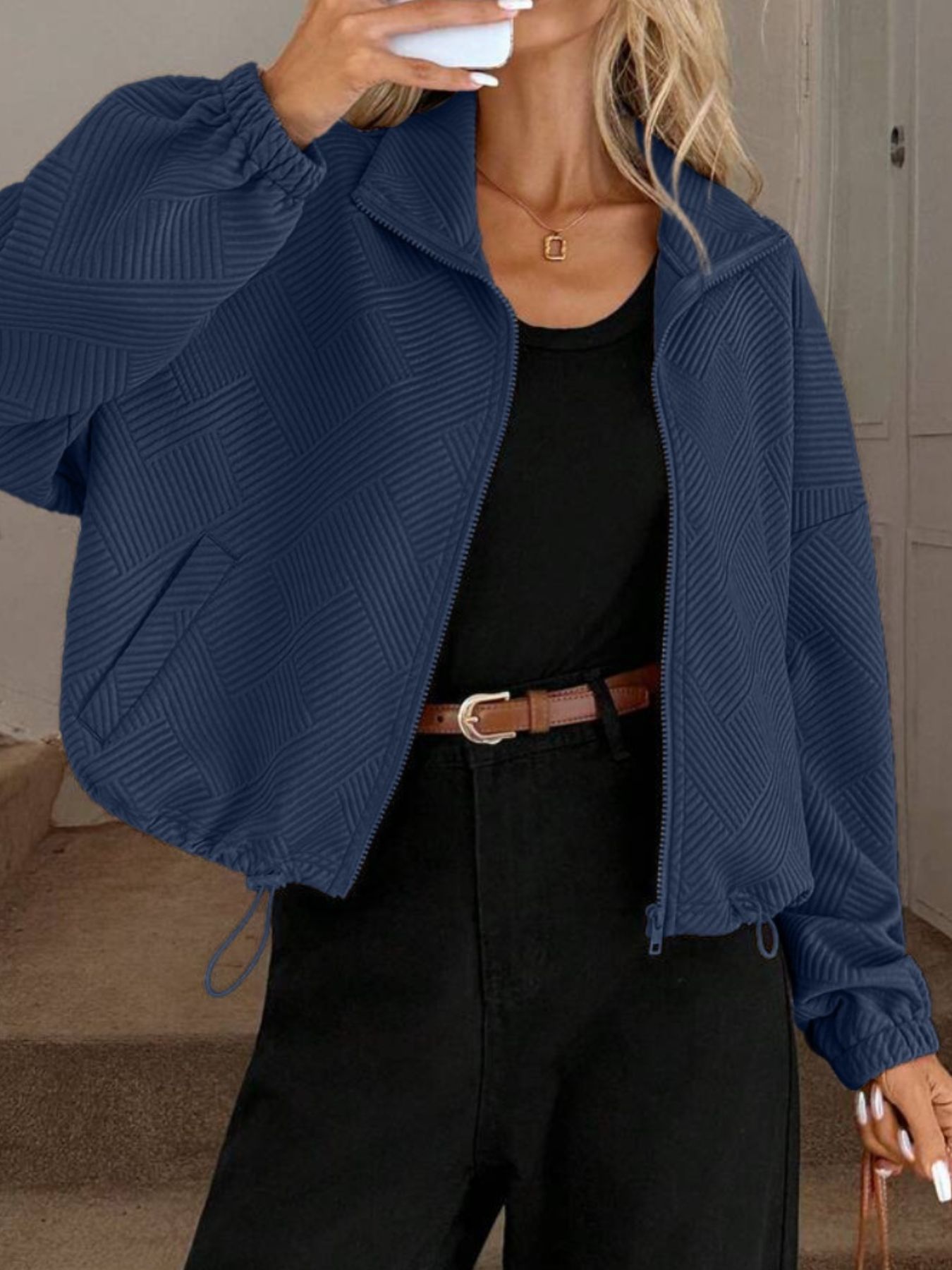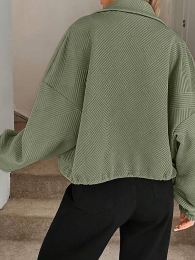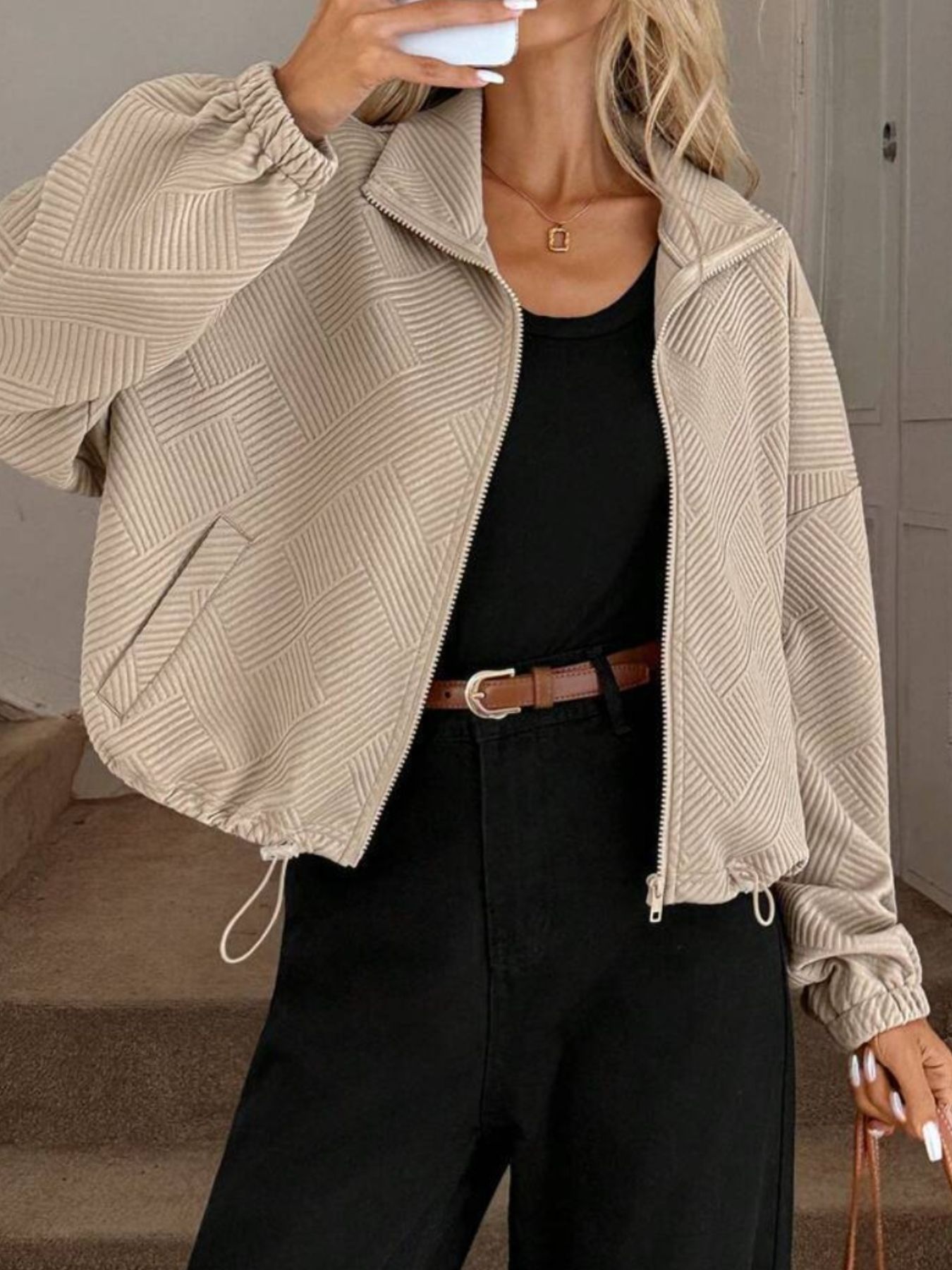 Textured Zip-Up Drawstring Hem Jacket