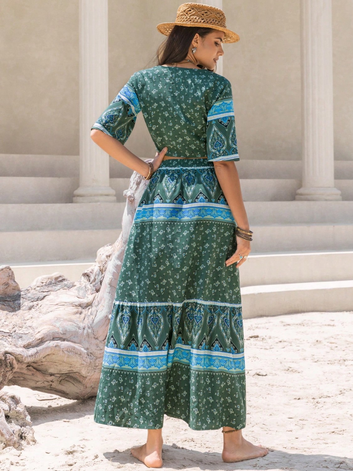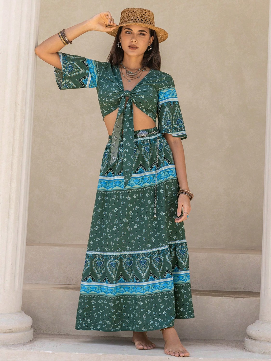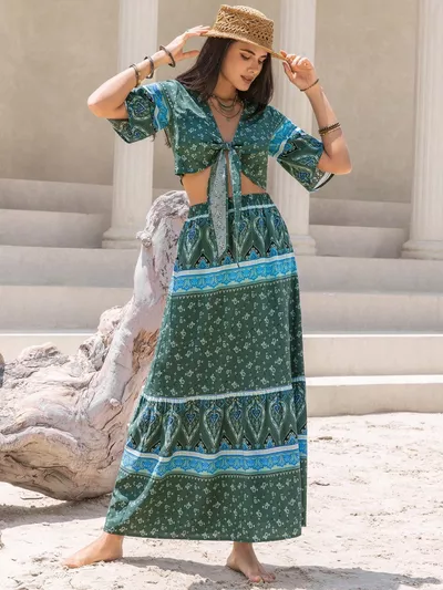 Tie Front Half Sleeve Top and Skirt Set