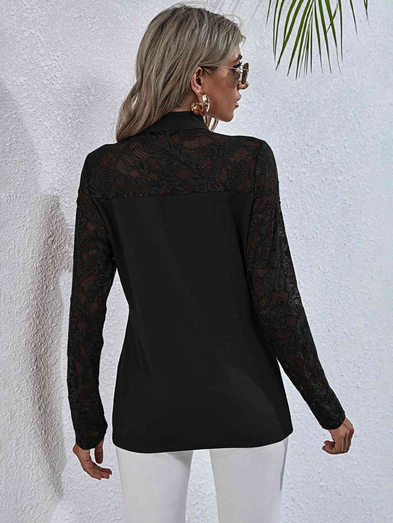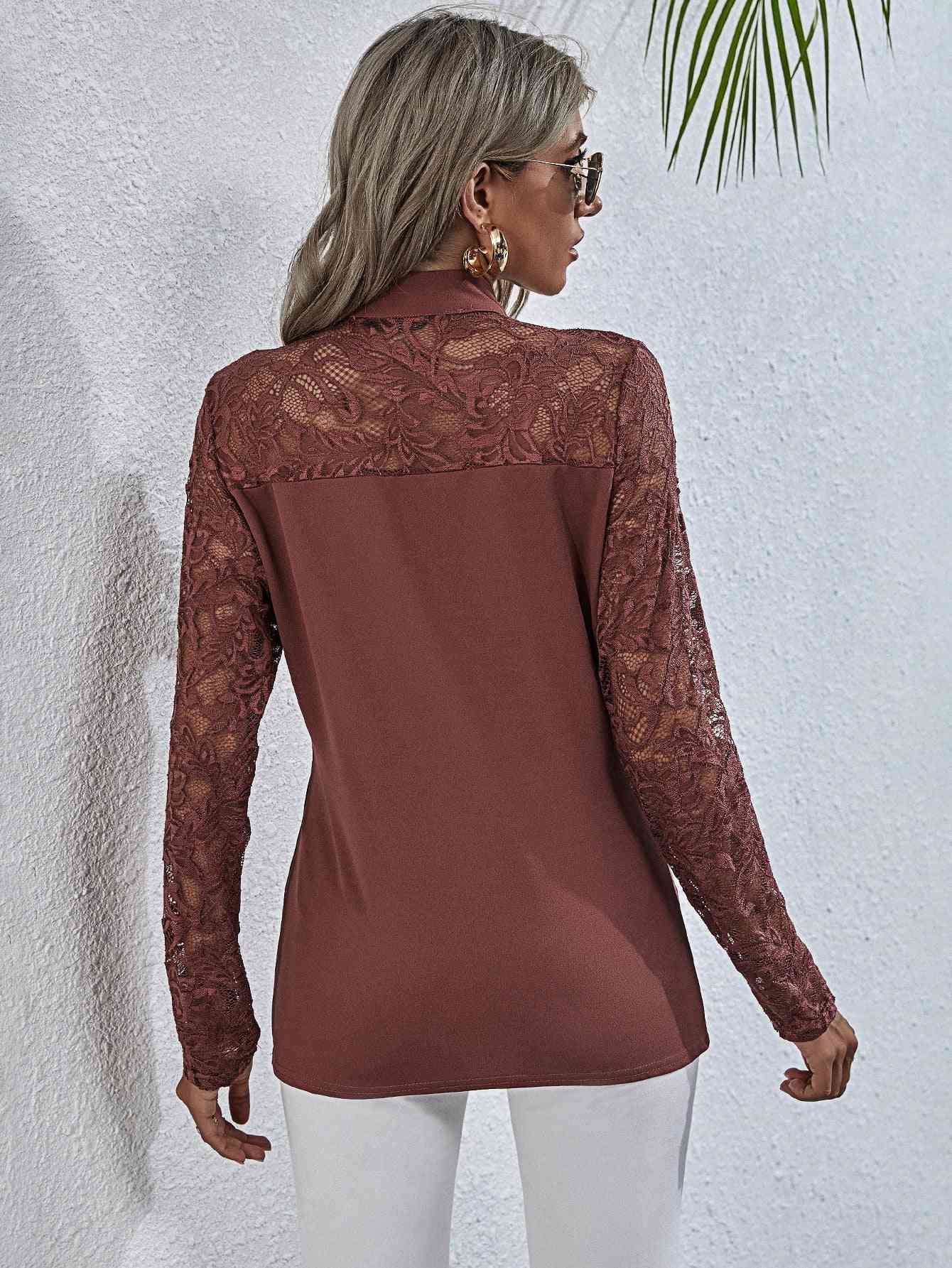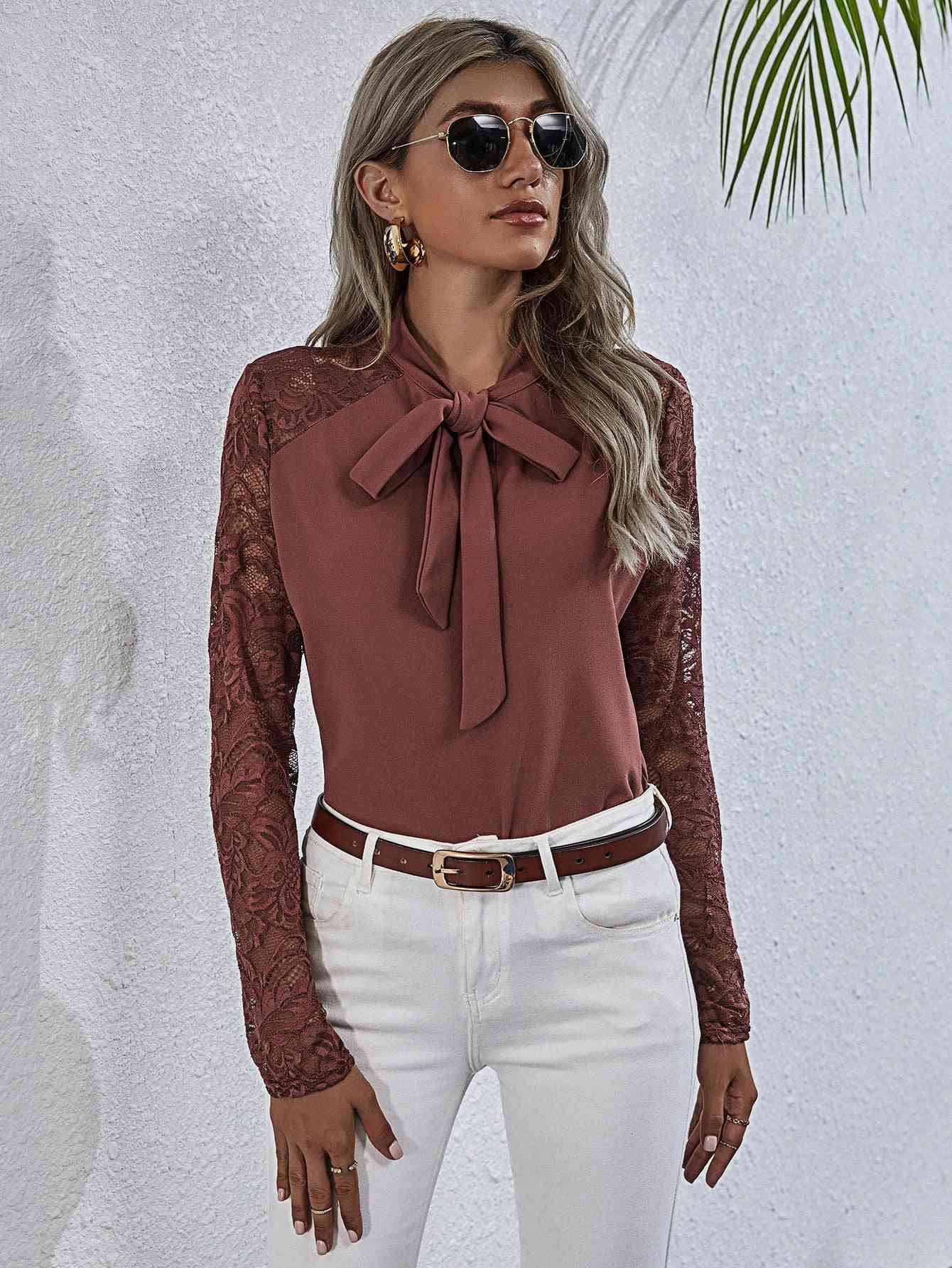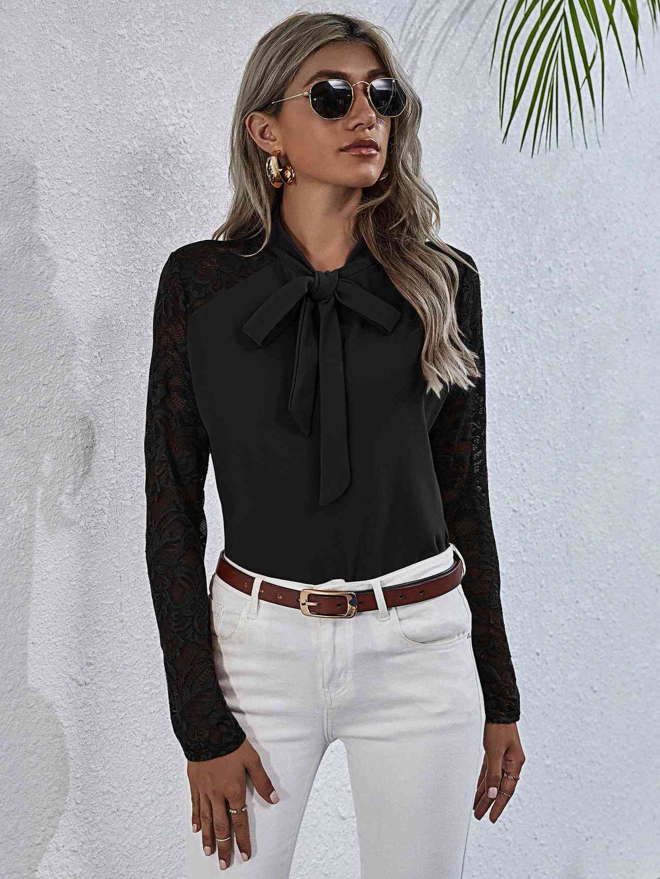 Tie Neck Spliced Lace Long Sleeve Top