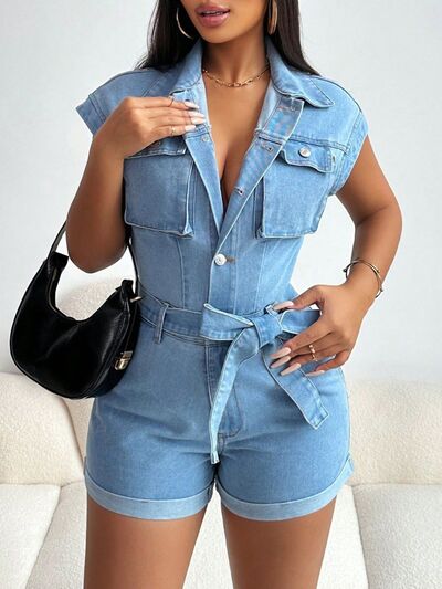 Tie Waist Cap Sleeve Denim Romper
