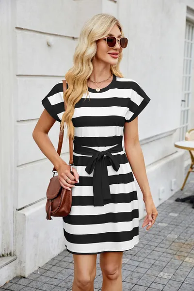 Tied Contrast Striped Short Sleeve Mini Tee Dress