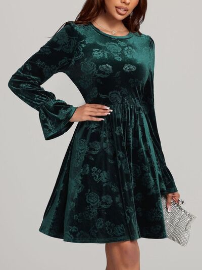 Tied Flower Print Round Neck Flounce Sleeve Dress