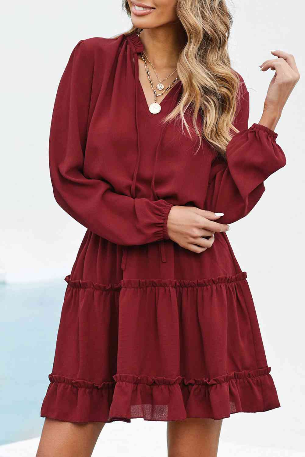 Tied Frill Trim Puff Sleeve Mini Dress
