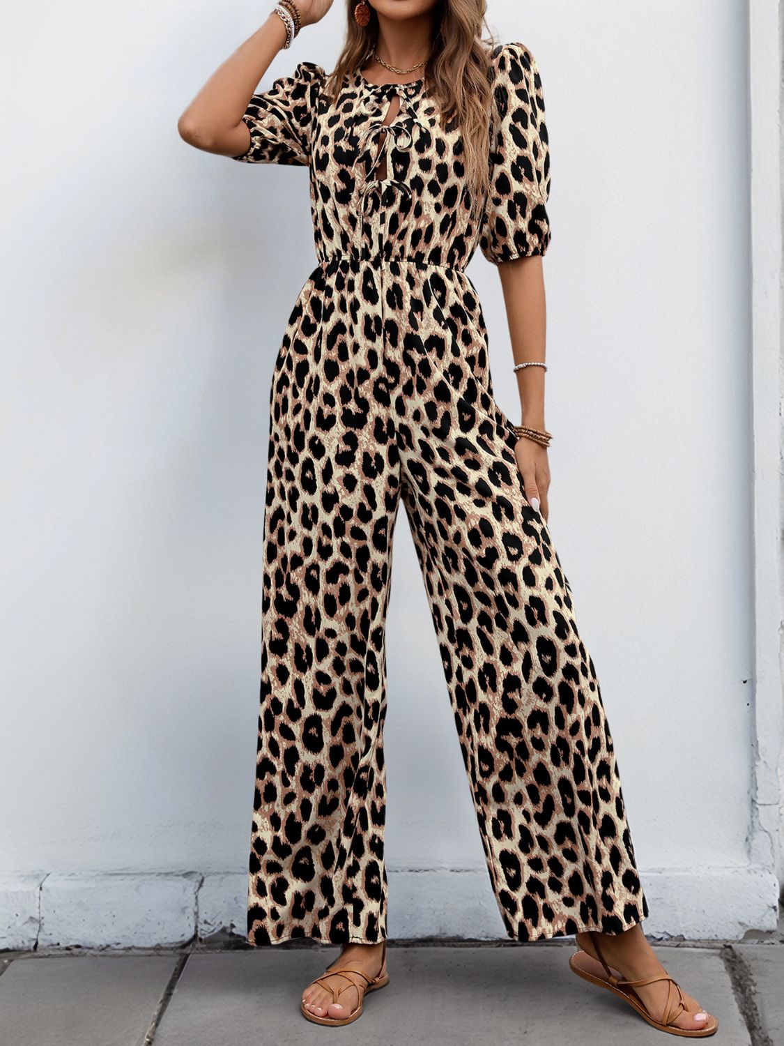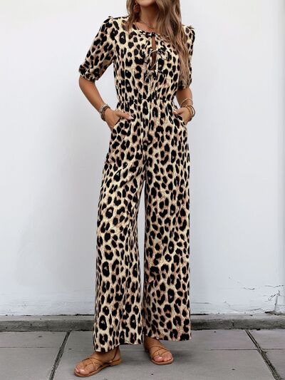 Tied Leopard Half Sleeve Jumpsuit