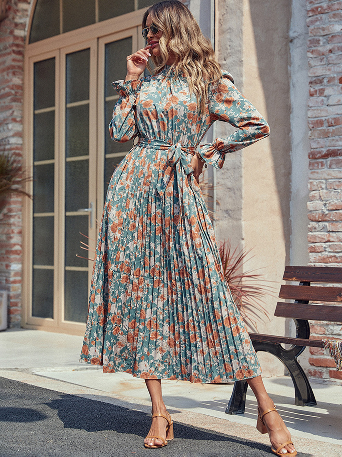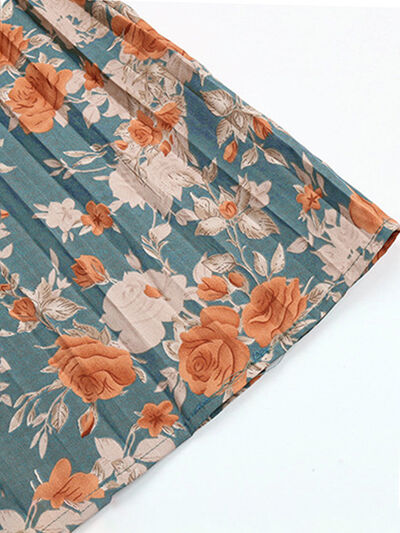Tied Pleated Printed Mock Neck Long Sleeve Dress
