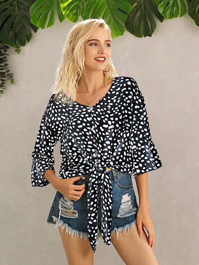 Tied Printed Button Up V-Neck Blouse