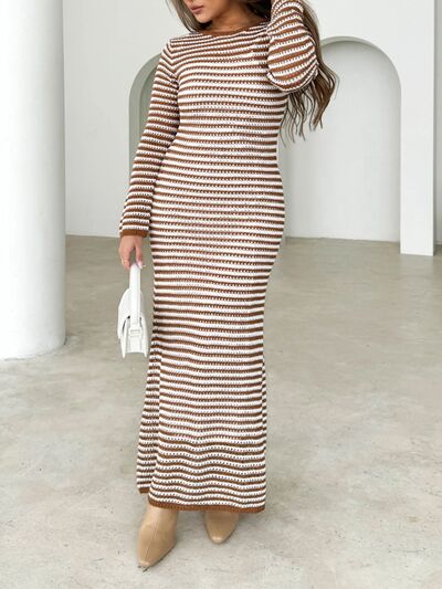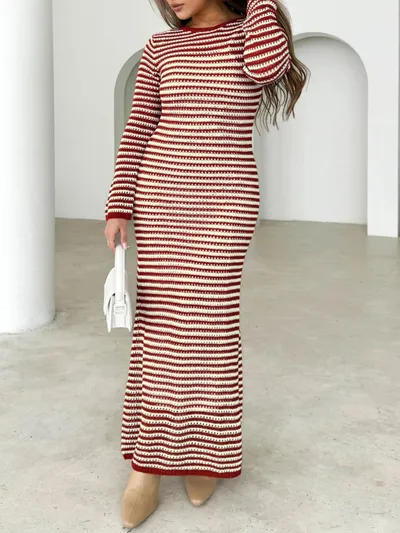 Tied Round Neck Striped Sweater Dress