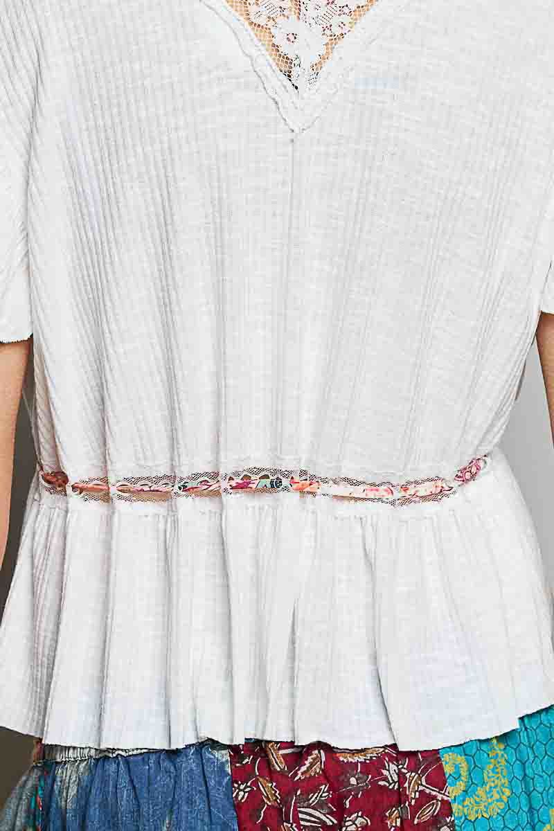 Tied Ruffled V-Neck Short Sleeve Blouse with Lace Detail