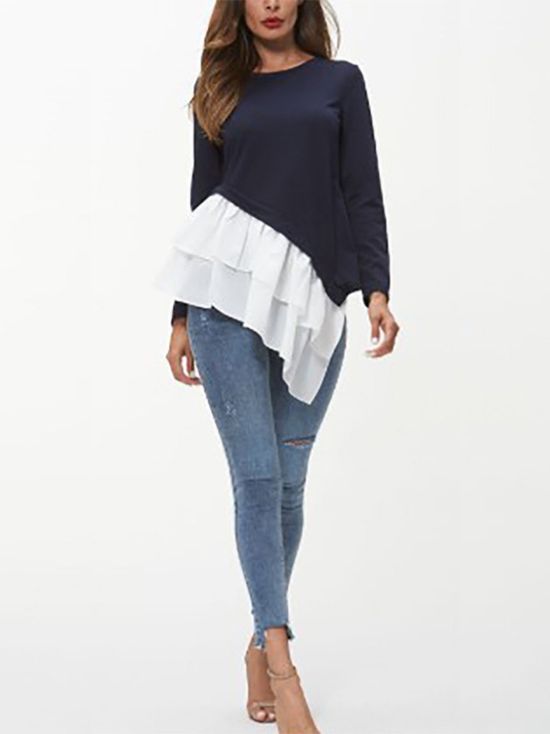 Tiered Contrast Round Neck Long Sleeve T-Shirt