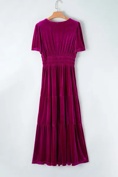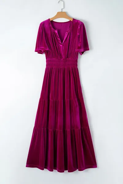 Tiered Notched Short Sleeve Dress with Pockets
