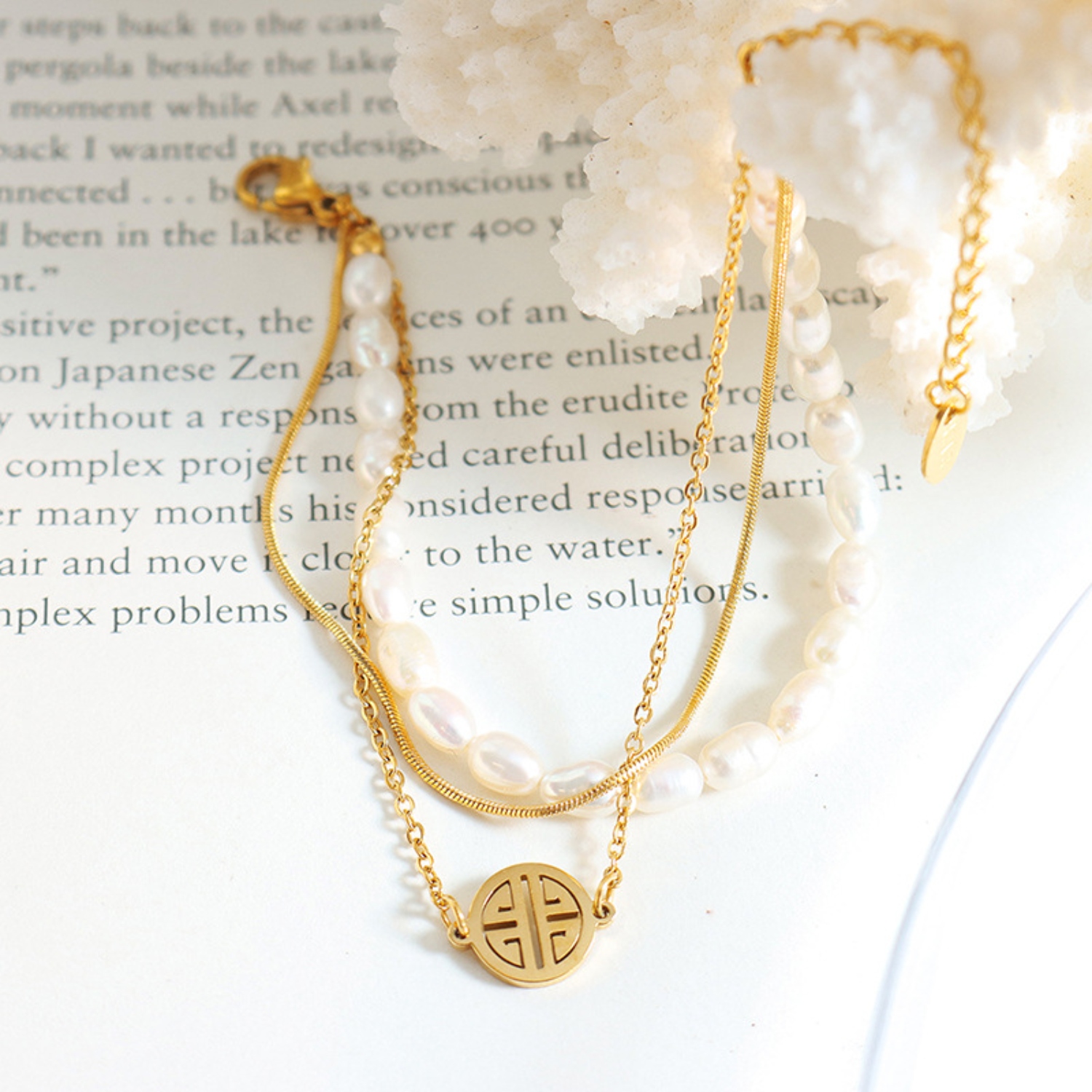 - Material: Freshwater pearl, Titanium steel, Gold-plated