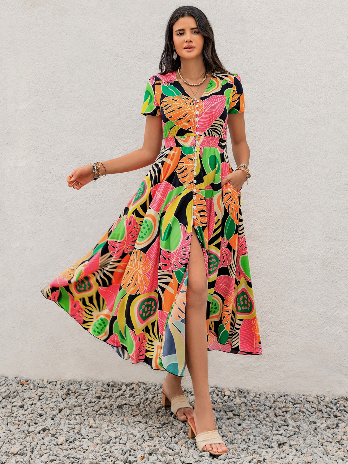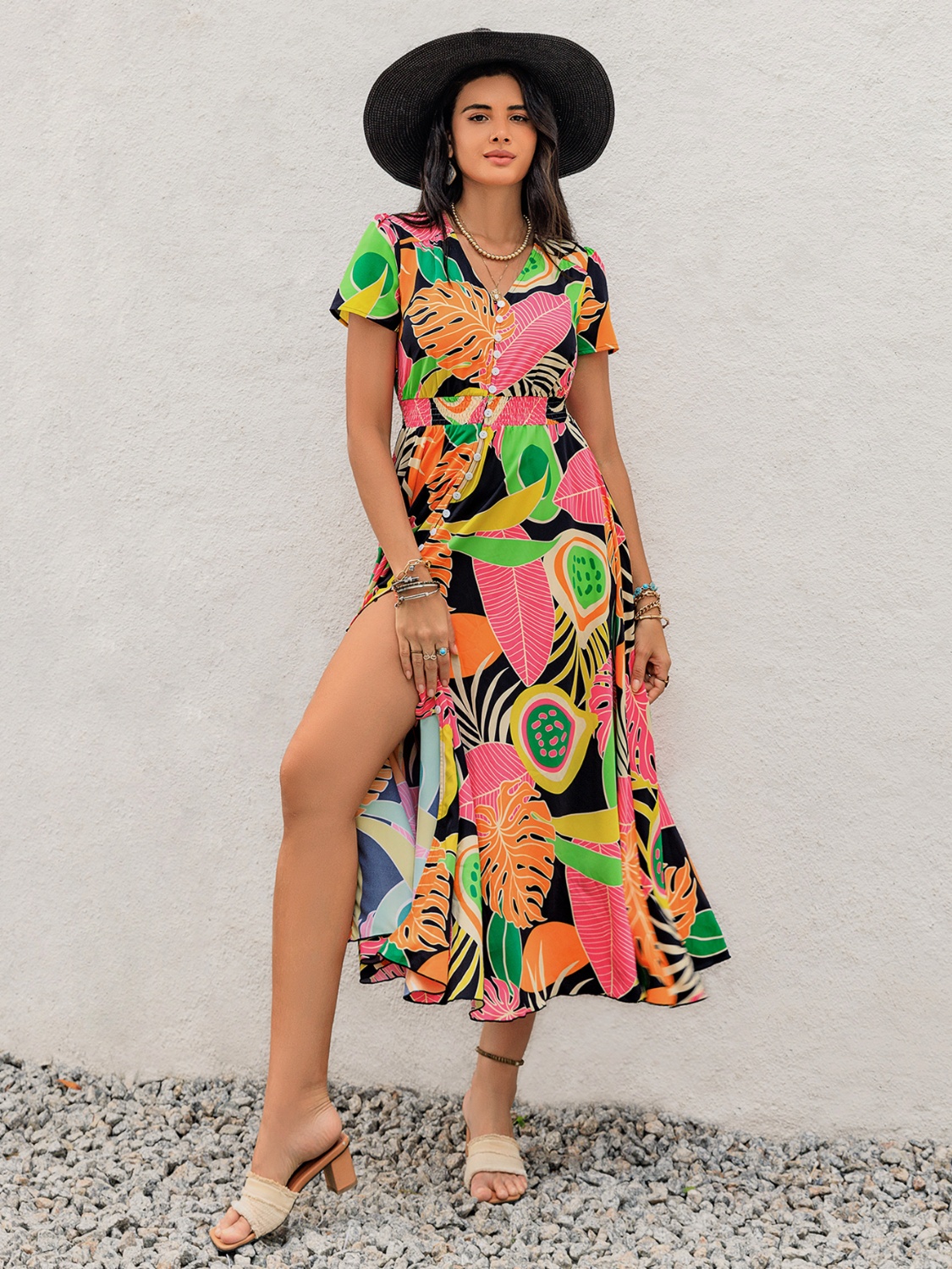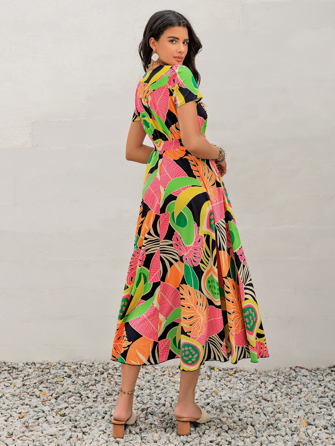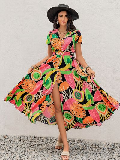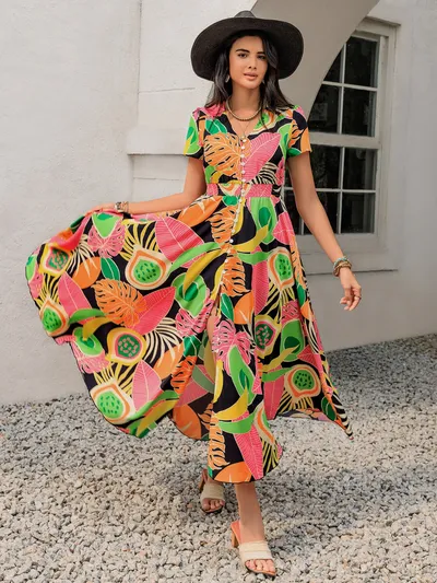 Tropical Print V-Neck Short Sleeve Midi Dress