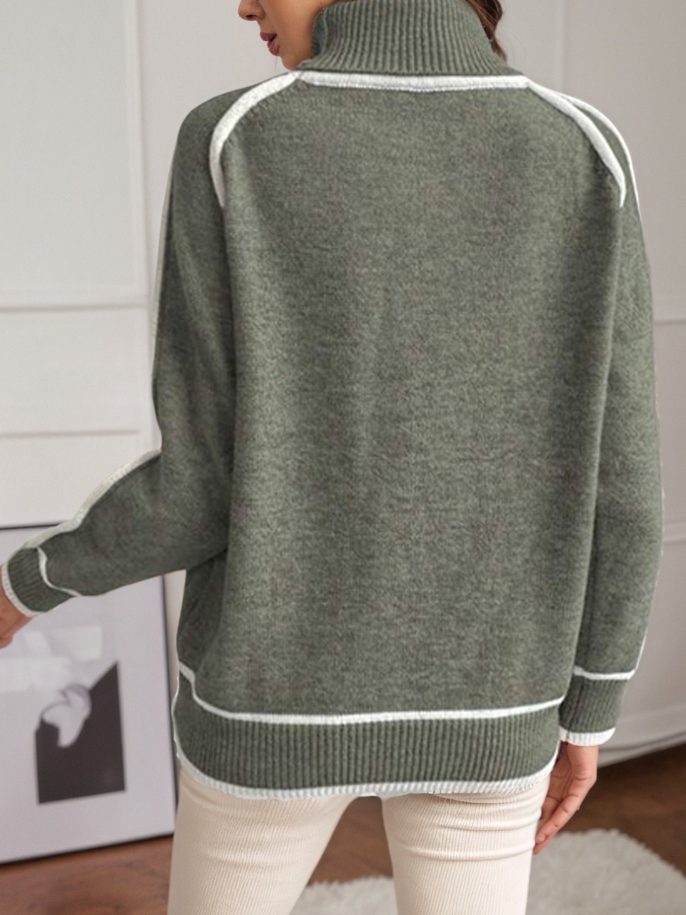 Turtleneck Contrast Trim Sweater with Ribbed Details