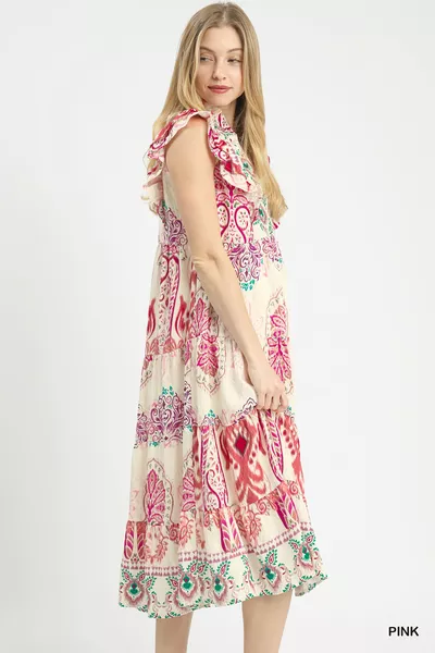 Umgee Boho Boarder Print Ruffle Midi Dress