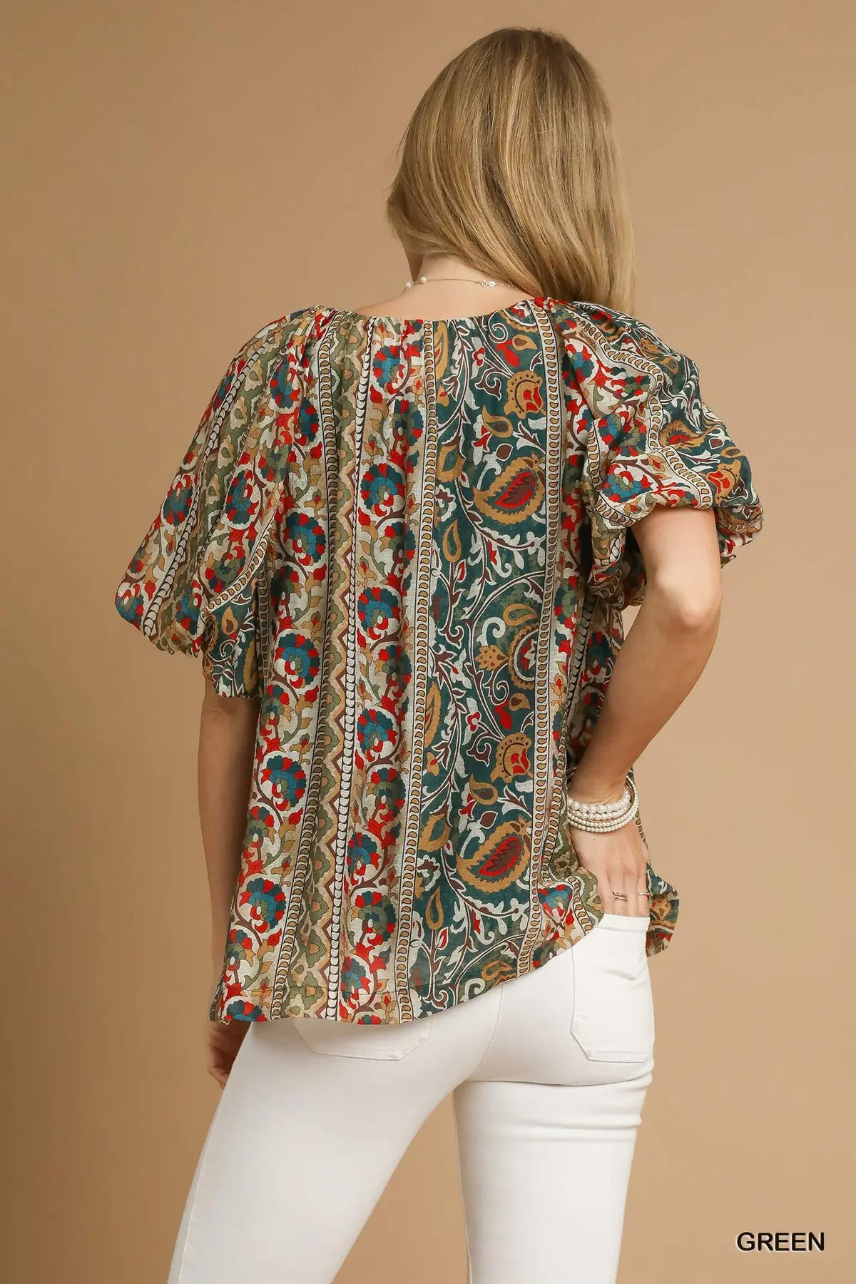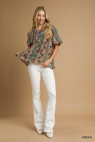 Umgee Boho Floral Stripe Puff Sleeve Blouse