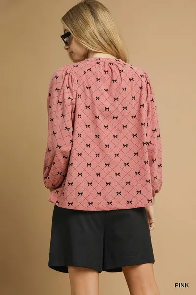 Umgee Corduroy Bow Print Balloon Sleeve Blouse
