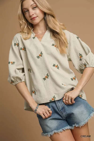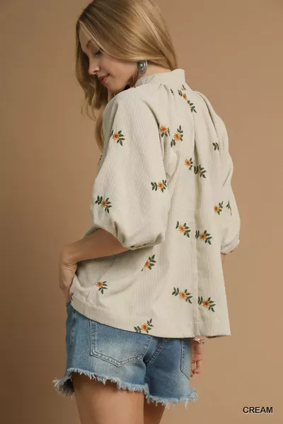 Umgee Corduroy Floral Embroidered Puff Sleeve Blouse