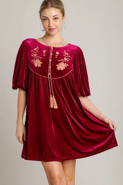 Umgee Embroidered Half Sleeve Velvet Mini Dress with Tassel
