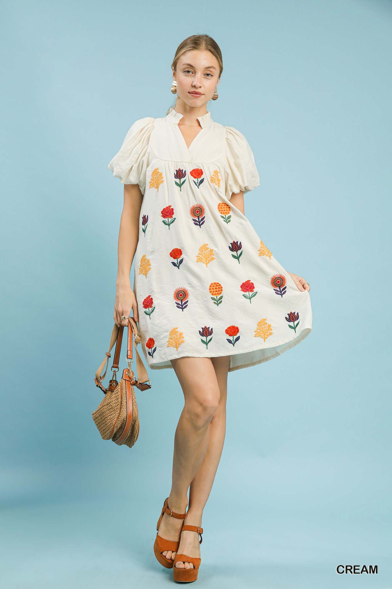 Umgee Floral Embroidered Puff Sleeve Mini Dress