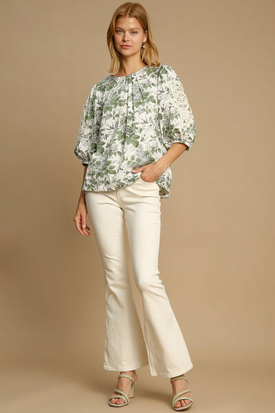 Umgee Floral Pleated Detail Lace Trim Sleeve Blouse