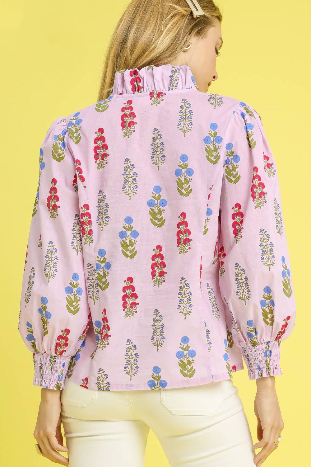 Umgee Floral Print Lantern Sleeve Button Down Shirt