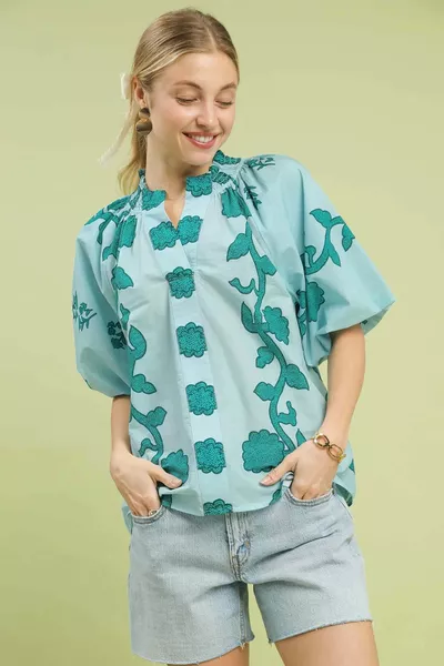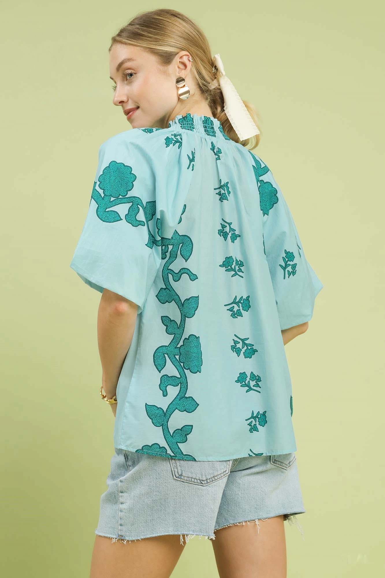 Umgee Floral Smocked Notched Puff Sleeve Blouse