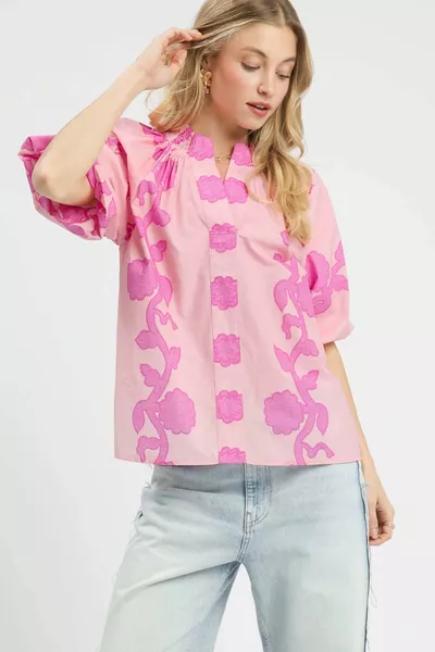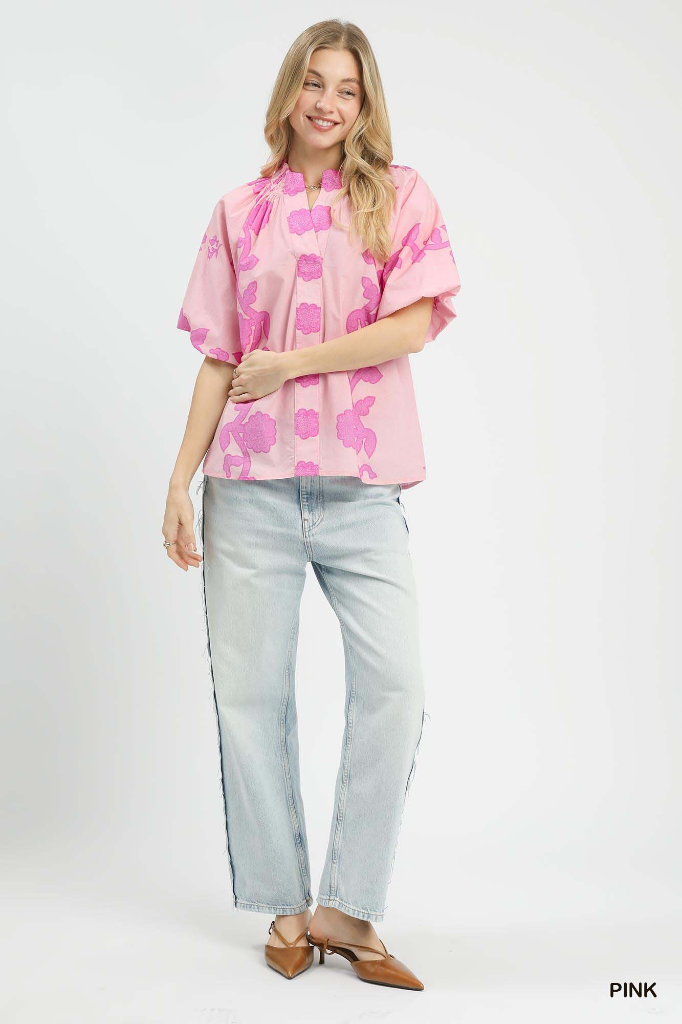 Umgee Floral Smocked Notched Puff Sleeve Blouse