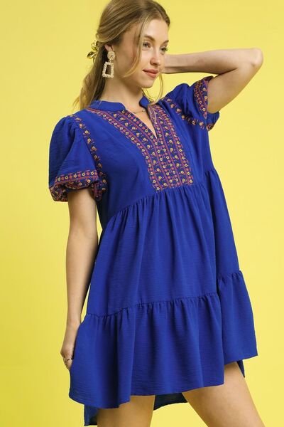 Umgee Floral Trim Puff Sleeve Mini Dress