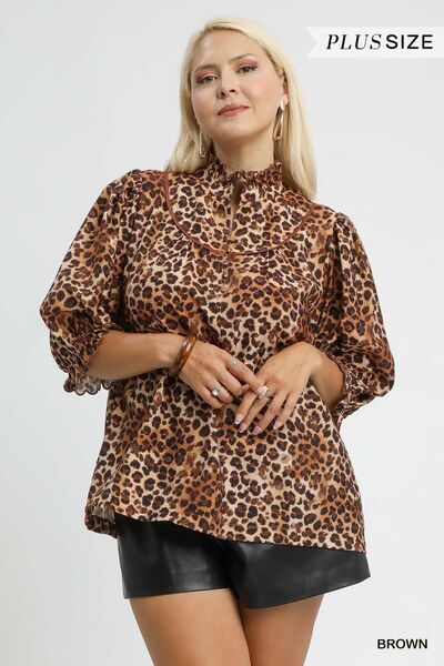 Umgee Full Size Leopard Print Ruffle Neck Blouse Plus Size