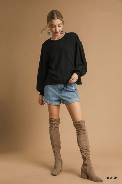 Umgee Full Size Linen Long Sleeve Top with Drawstring Plus Size