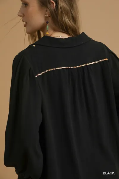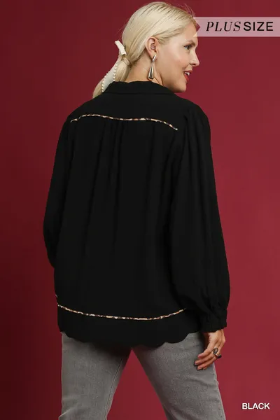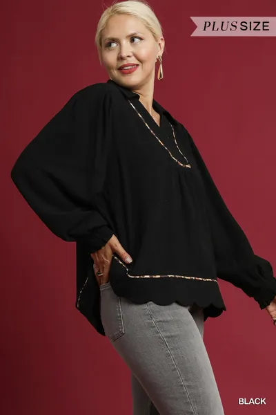 Umgee Full Size Linen Scallop Hem Blouse with Contrast Trim Plus Size