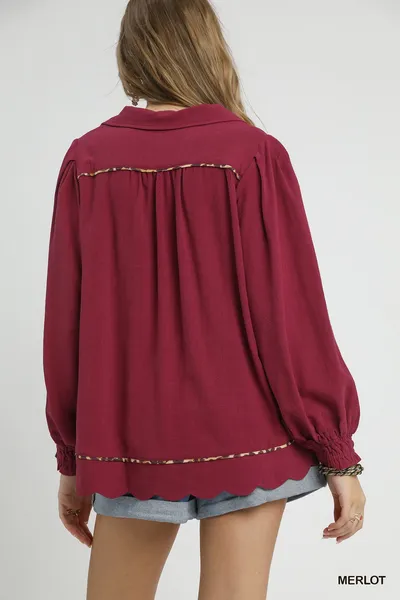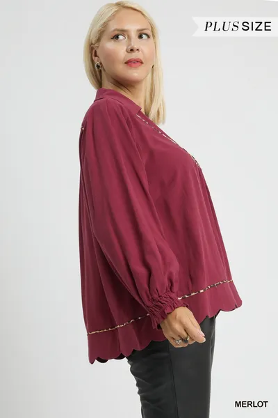 Umgee Full Size Linen Scallop Hem Blouse with Contrast Trim Plus Size