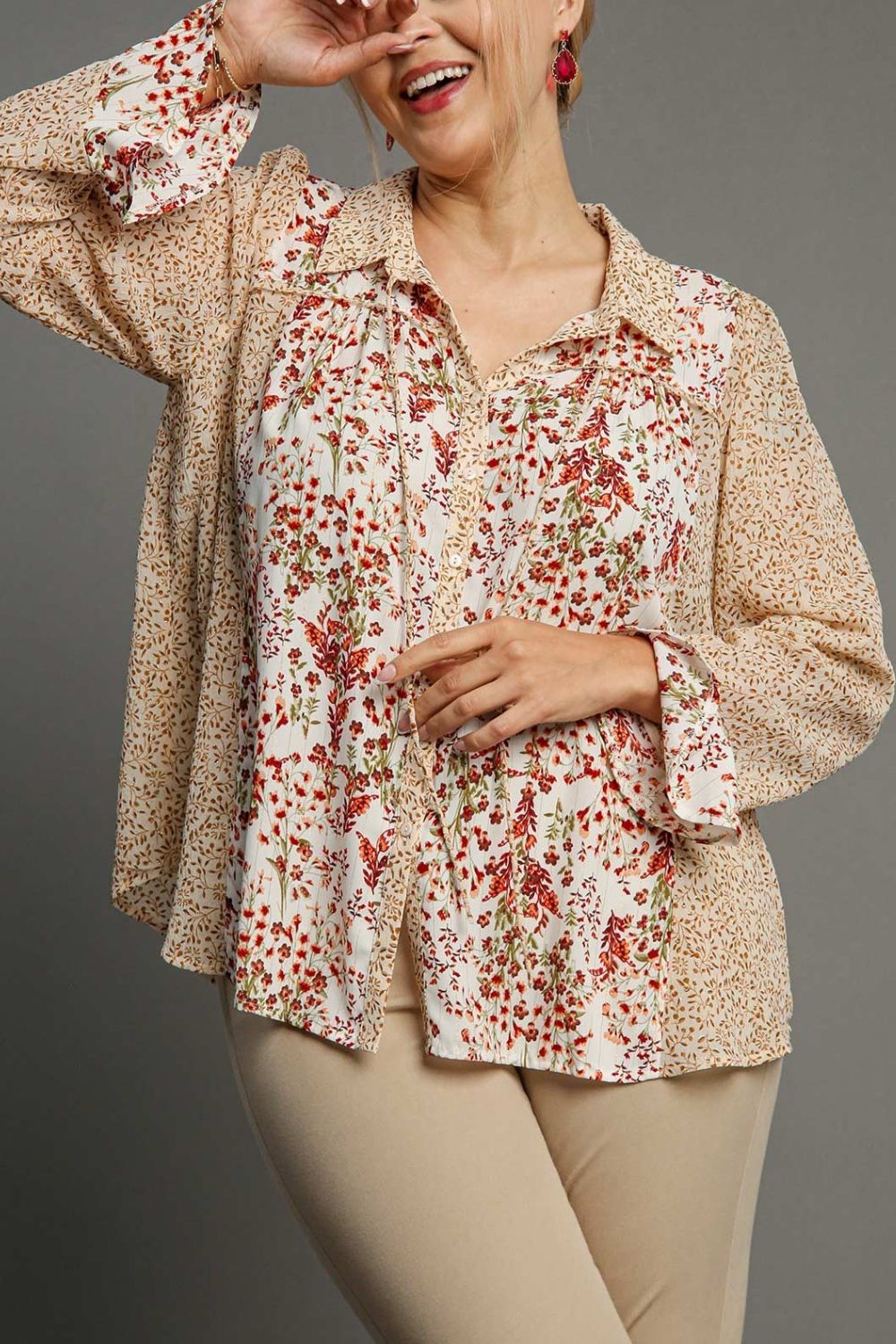 Umgee Full Size Mixed Print Metallic Detail Long Ruffle Sleeve Button Down Shirt Plus Size