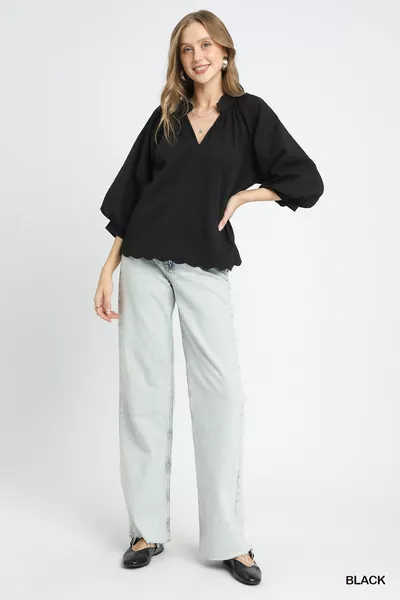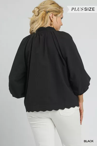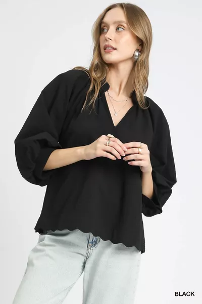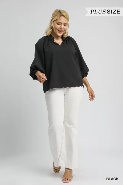 Umgee Full Size Textured Notched Balloon Sleeve Blouse Plus Size