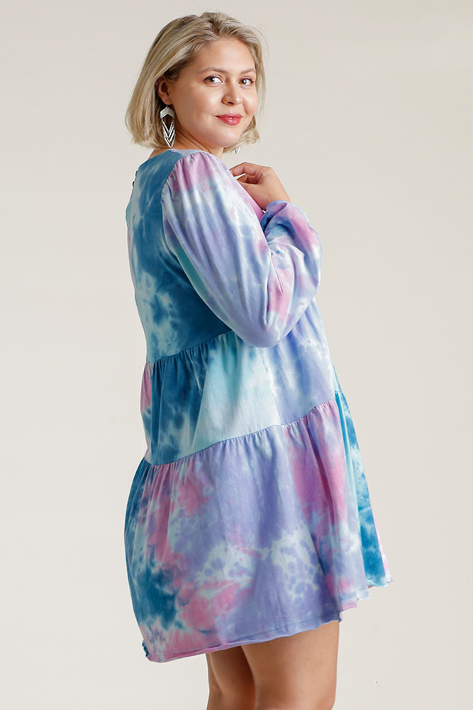 Umgee Full Size Tie Dye Round Neck Long Sleeve Babydoll Tiered Dress Plus Size