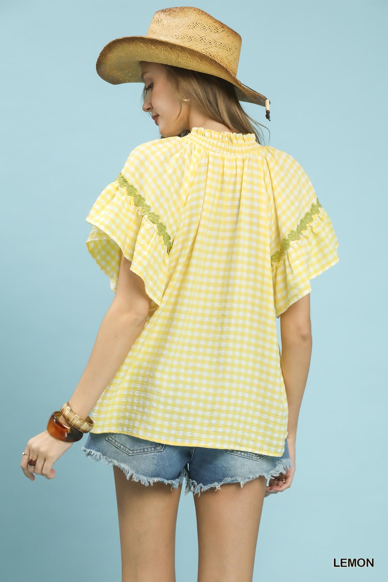 Umgee Gingham Lace Trim Top