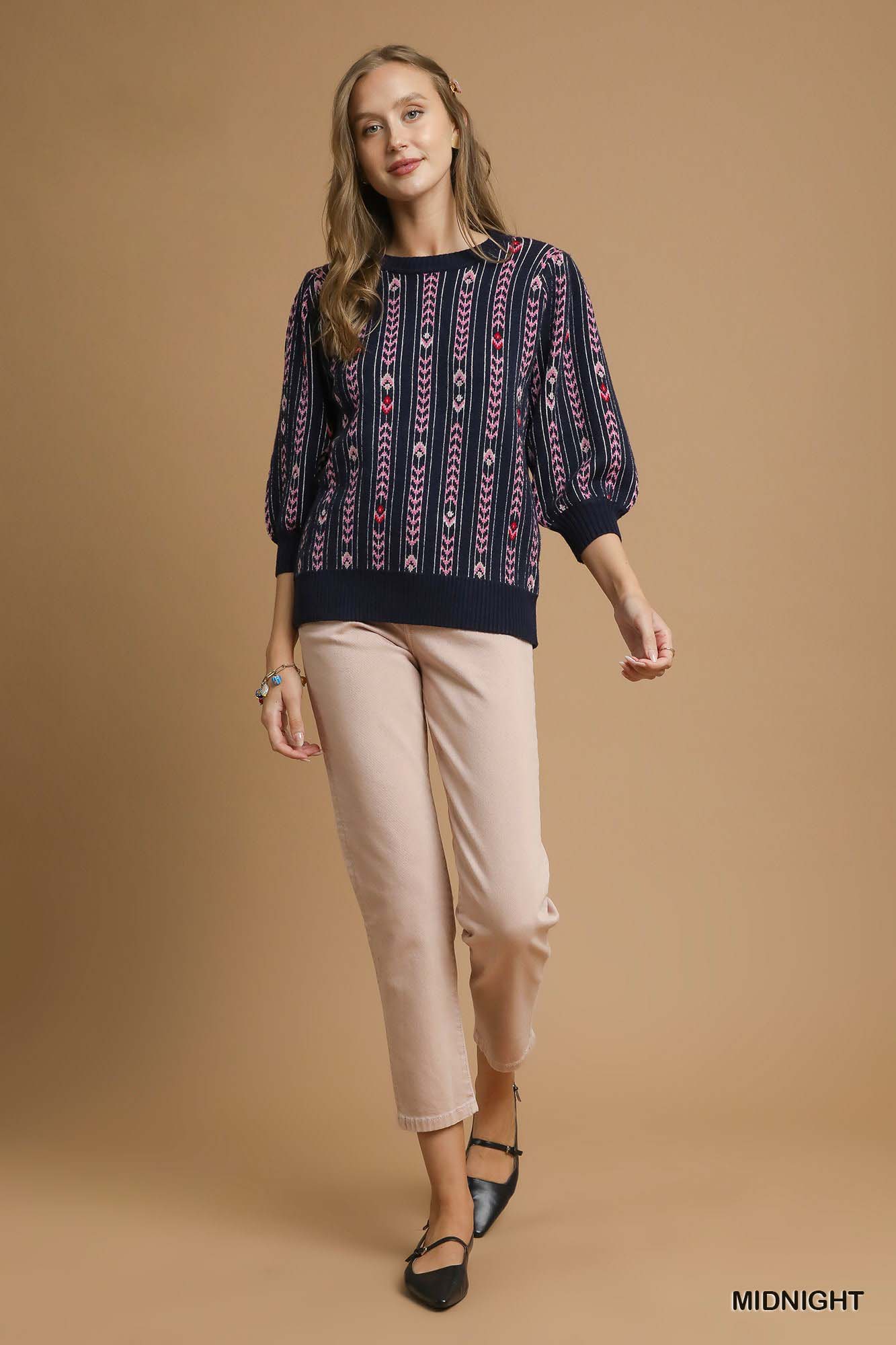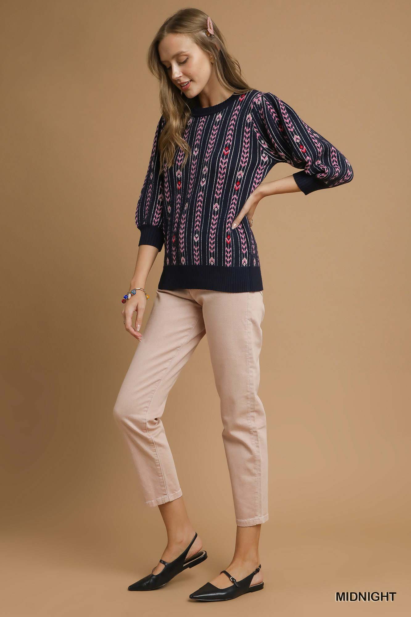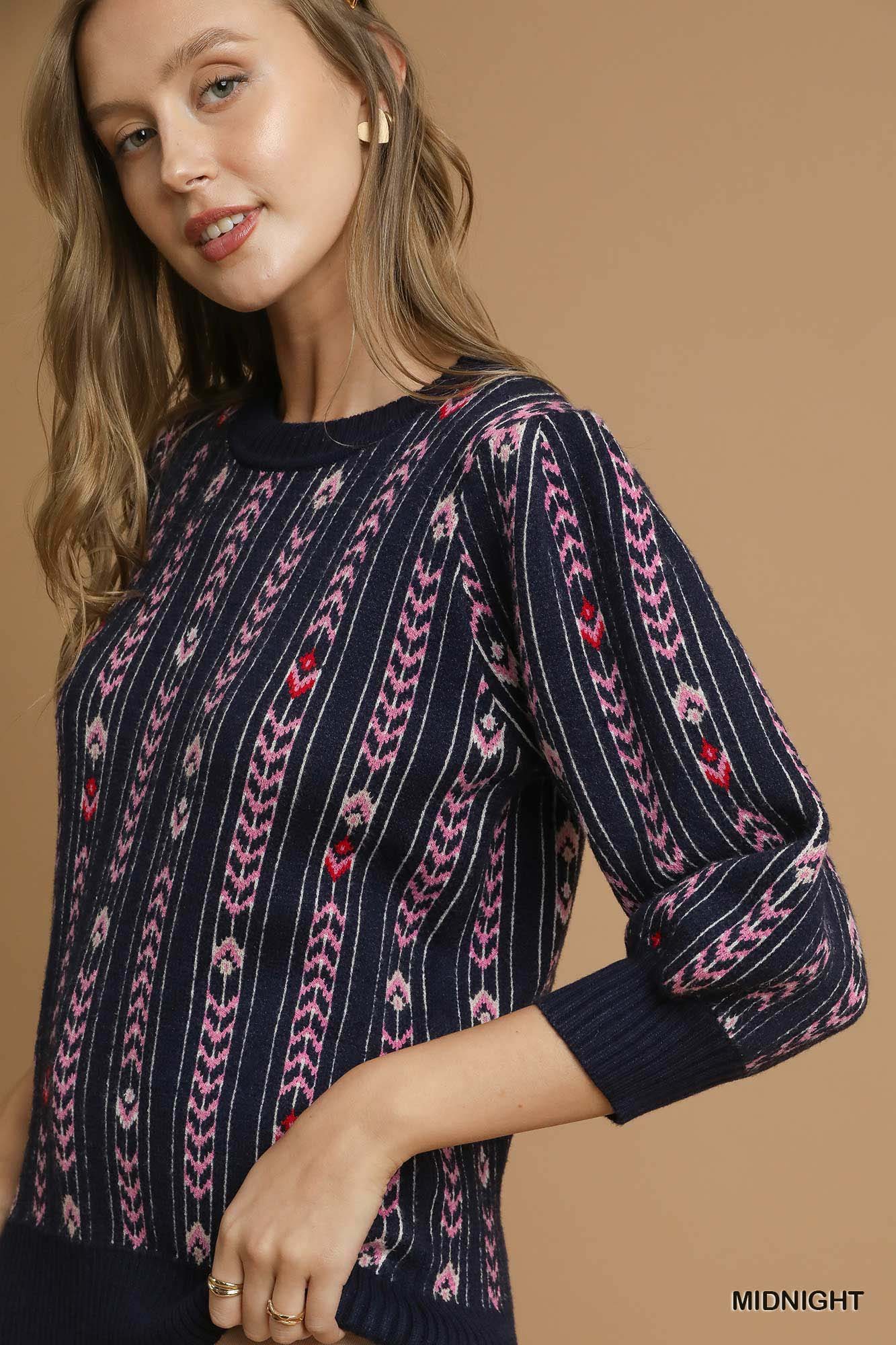 Umgee Jacquard Knit Puff Sleeve Sweater