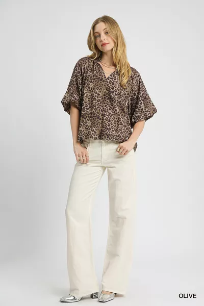 Umgee Leopard Bubble Sleeve Scalloped Hem Blouse