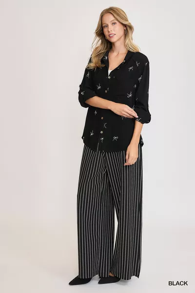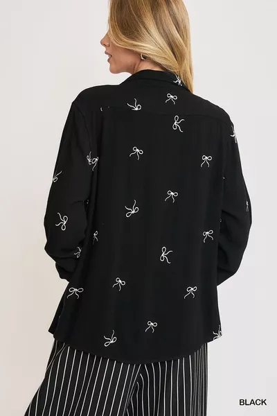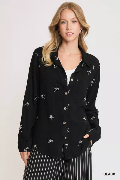 Umgee Linen Blend Fitted Shirt with Ribbon Embroidery Details