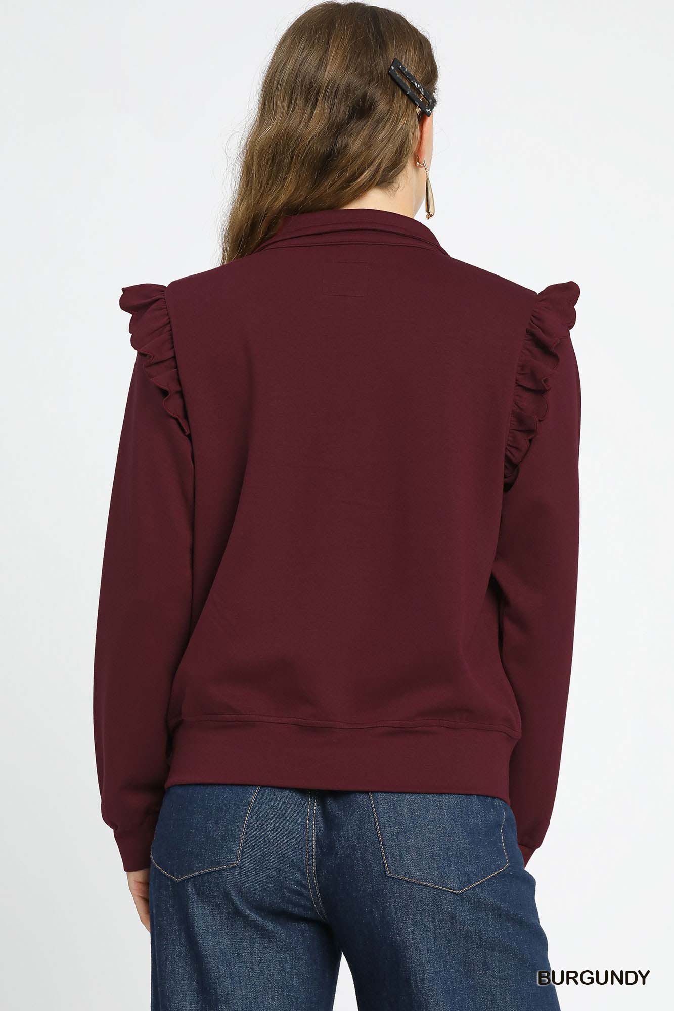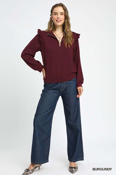 Umgee Luxeknit Ruffle Shoulder Quarter-Zip Sweatshirt