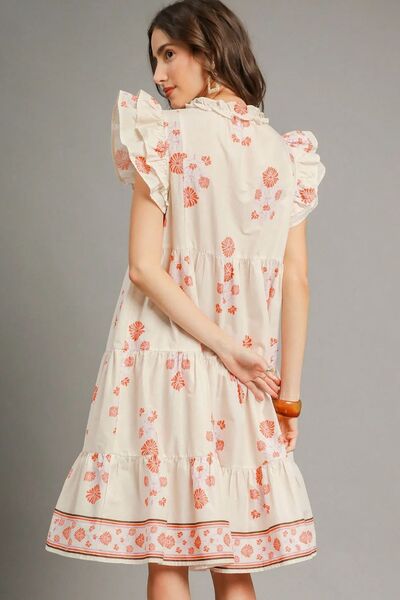 Umgee Printed Tie Neck Ruffle Cap Sleeve Dress