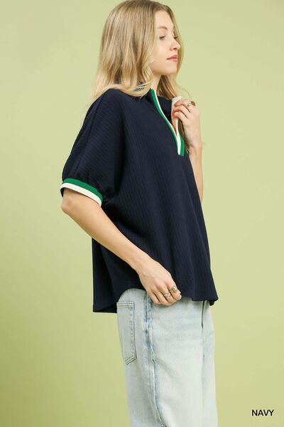 Umgee Textured Knit Top with Striped Contrast Trim