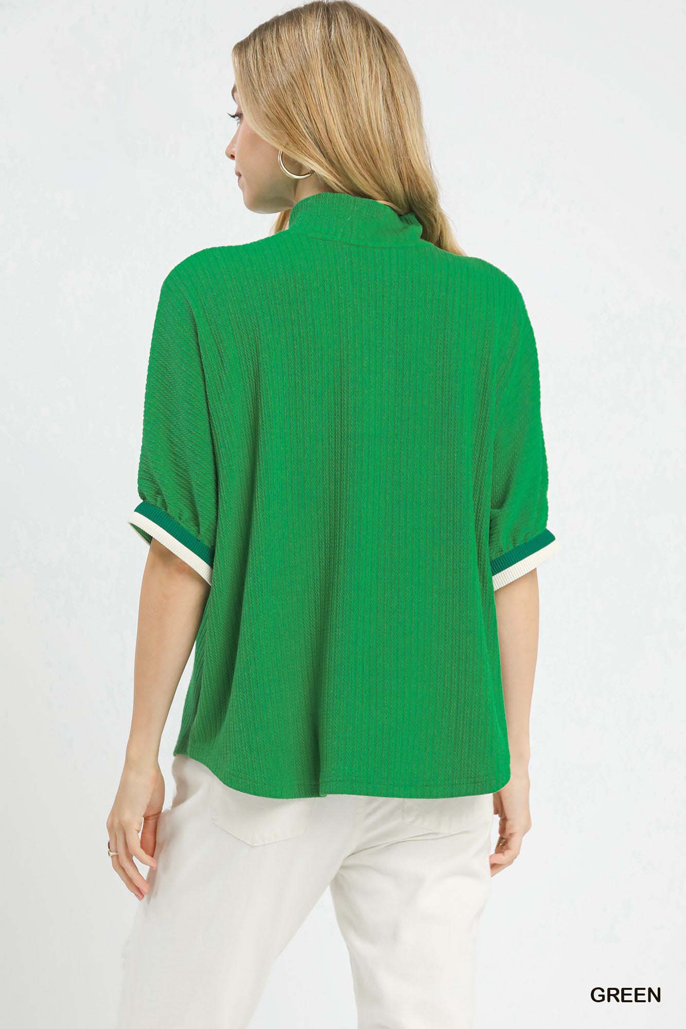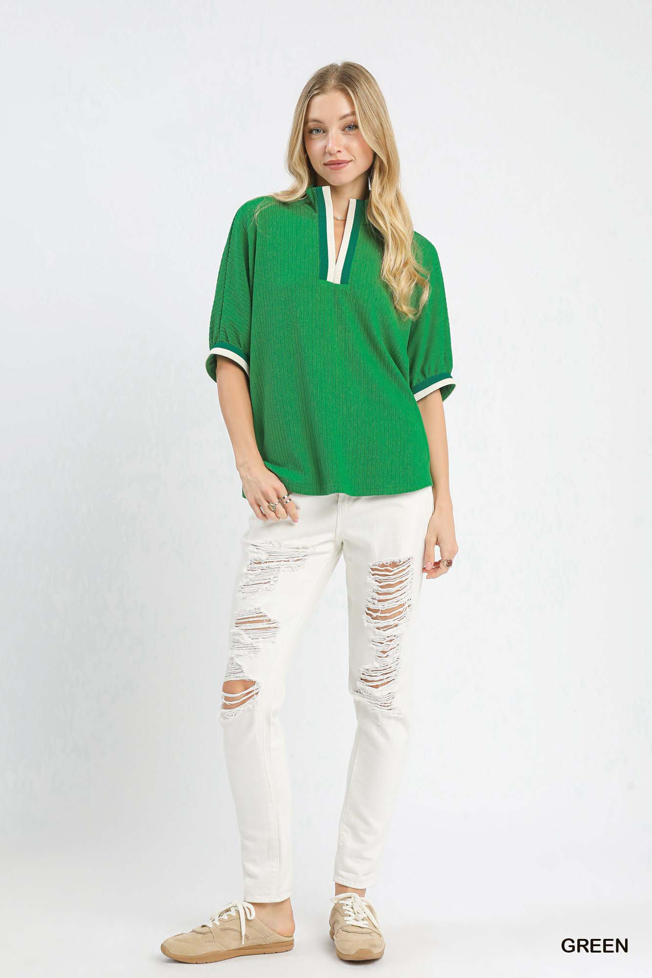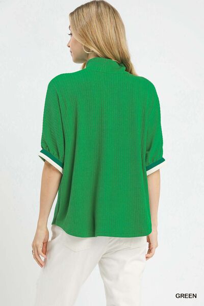 Umgee Textured Knit Top with Striped Contrast Trim