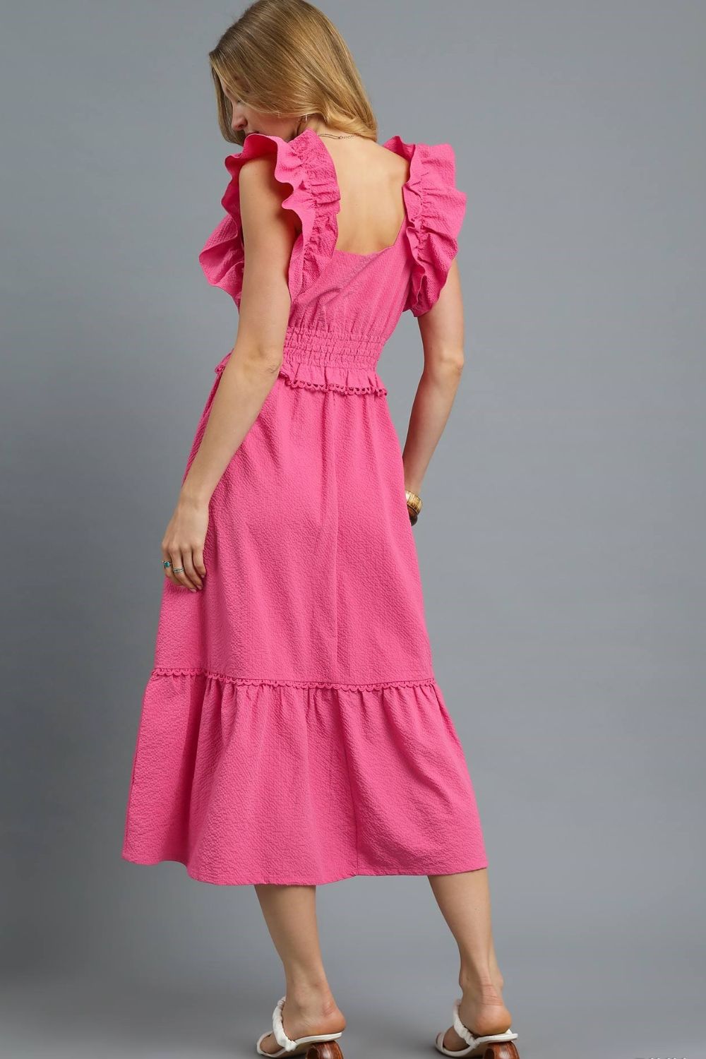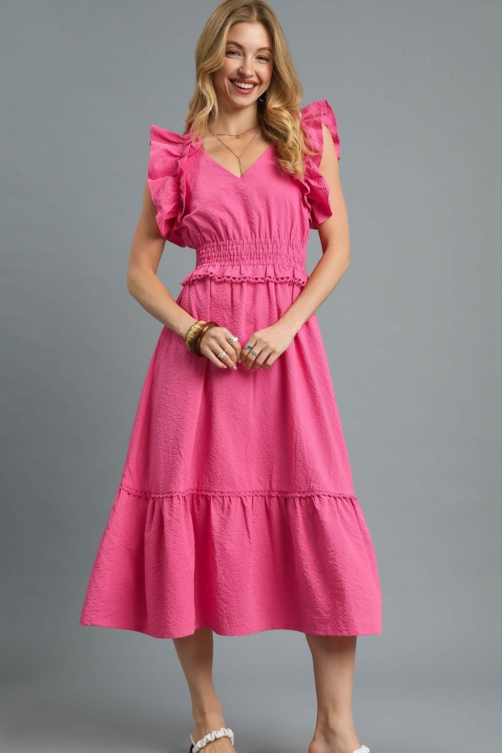 Umgee V-Neck Ruffled Cap Sleeve Midi Dress