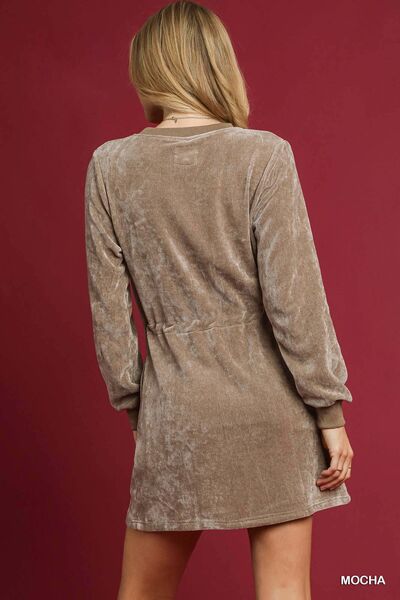 Umgee Velour Drawstring Mini Dress with Long Sleeves