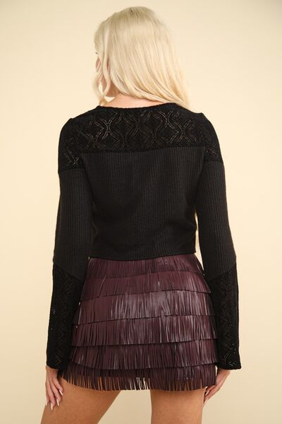 V-Neck Lace Detail Button Down Crop Ribbed Knit Top